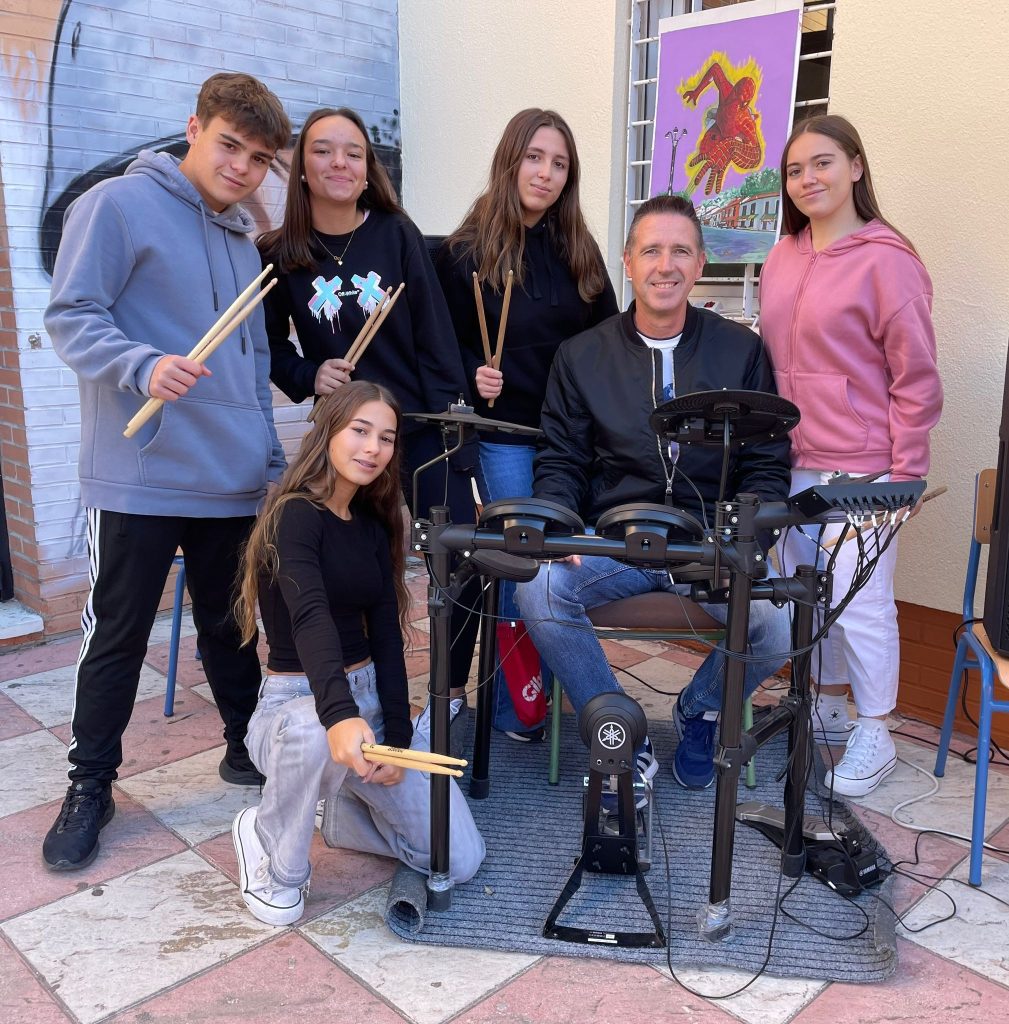 Jueves 20: Exhibición de batería eléctrica del antiguo alumnado de COMBO musical de 4º de ESO, Elena, Alejandra, Sergio y Aitana y una alumna de 3º ESO COMBO, Vega.