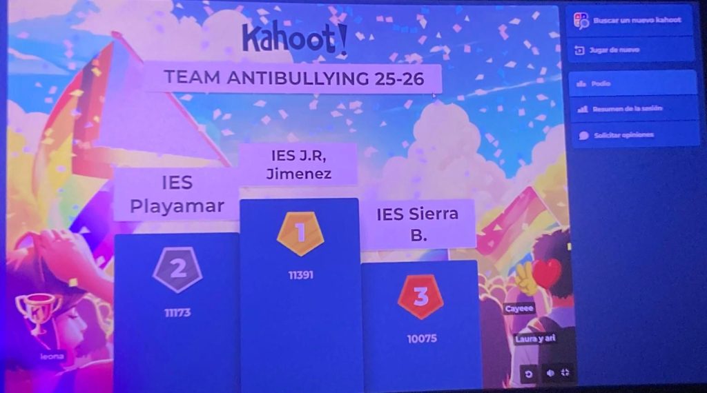 📱 La emoción llegó al máximo con el Kahoot intercentros. ¡Nuestro alumnado compitió con muchísima energía contra el IES Jacaranda, IES Sierra Bermeja e IES Juan Ramón Jiménez, logrando subir al podio en 2ª posición! 🏆🥈